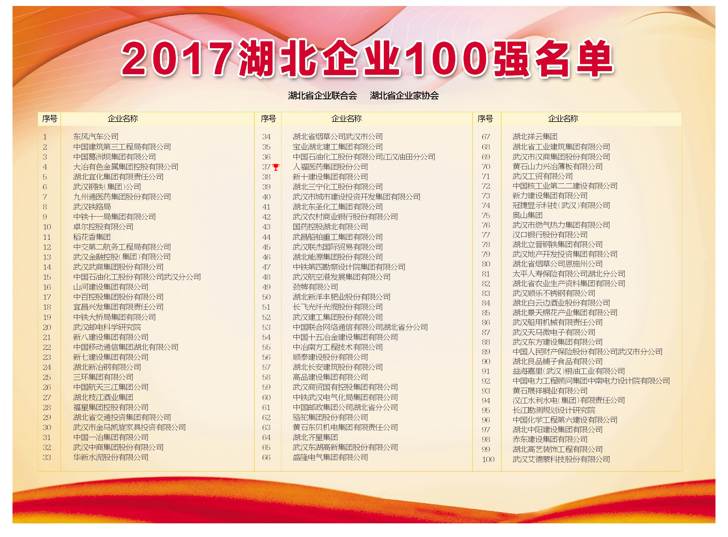 7月6日,湖北省企业联合会、湖北省企业家协会在汉发布2017湖北企业百强。东风汽车、中建三局、葛洲坝集团排名前三。必一·运动(B-Sports)此次排名第37位,较去年的排名上升了8位。